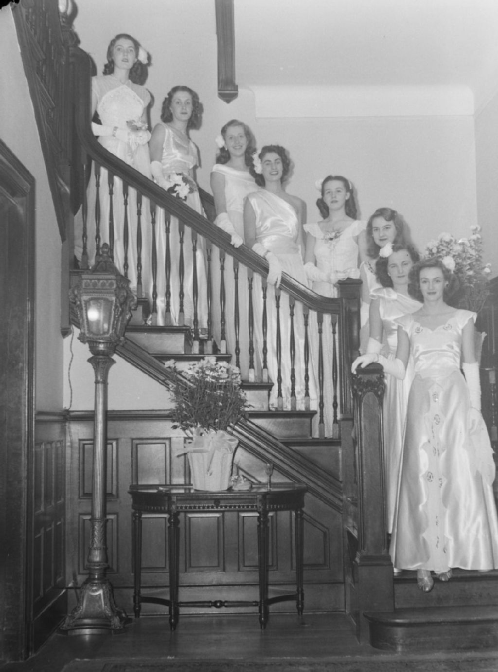 Nous voyons huit jeunes femmes en robe longue debout sur les marches d'un escalier. Elles s'en vont au bal de la Victoire