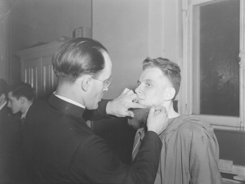 Nous voyons deux comédiens de la troupe de théâtre des Compagnons de Saint-Laurent avant une représentation théâtrale. Un des comédien colle la barbe de l'autre