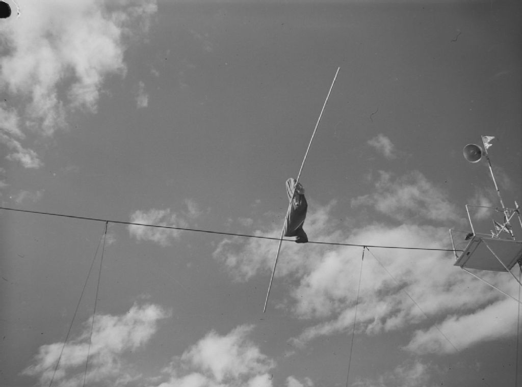 Un funambule, au visage recouvert d'un sac et tenant un balancier, marche sur une corde suspendue au-dessus du stade lors d'un rodéo présenté au stade Delorimier à Montréal