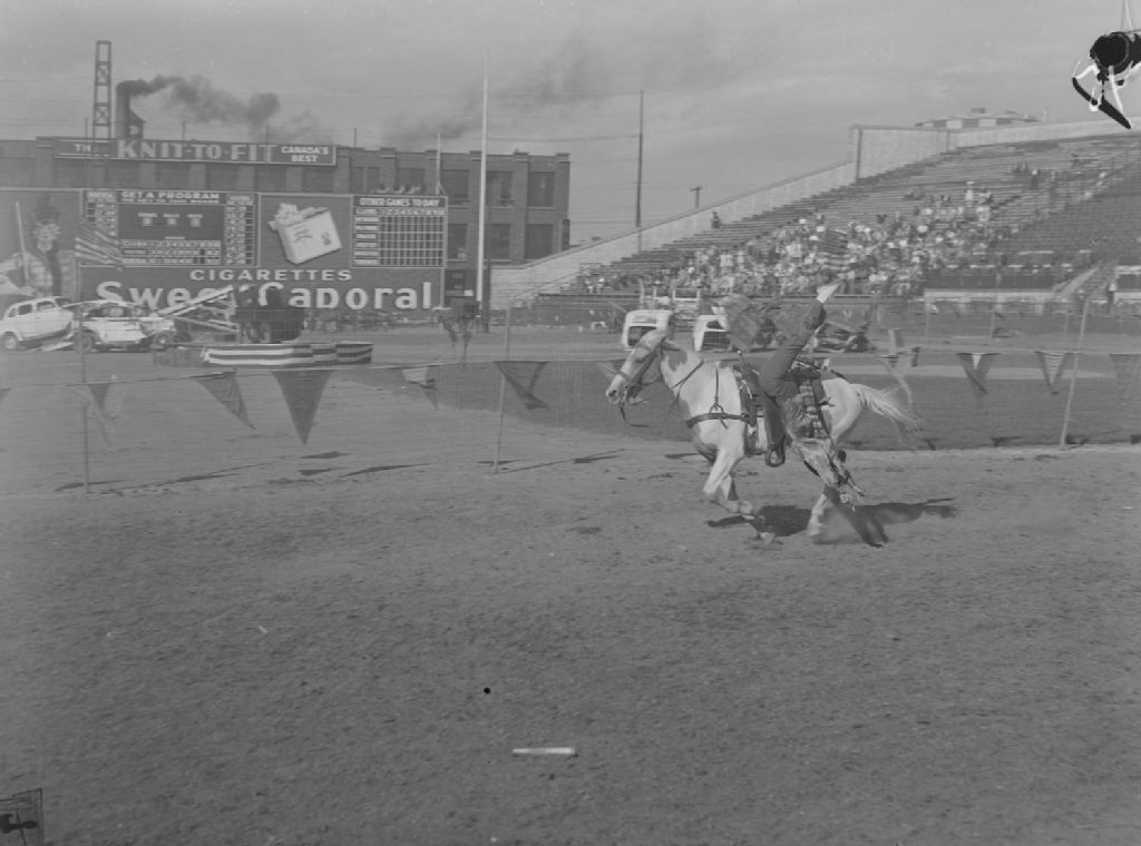 Un cavalier tombe en bas de sa monture qui file au galop lors d'un rodéo présenté au stade Delorimier à Montréal. Nous remarquons la manufacture Grover Mills Ltd. Knit to Fit à l'arrière-plan