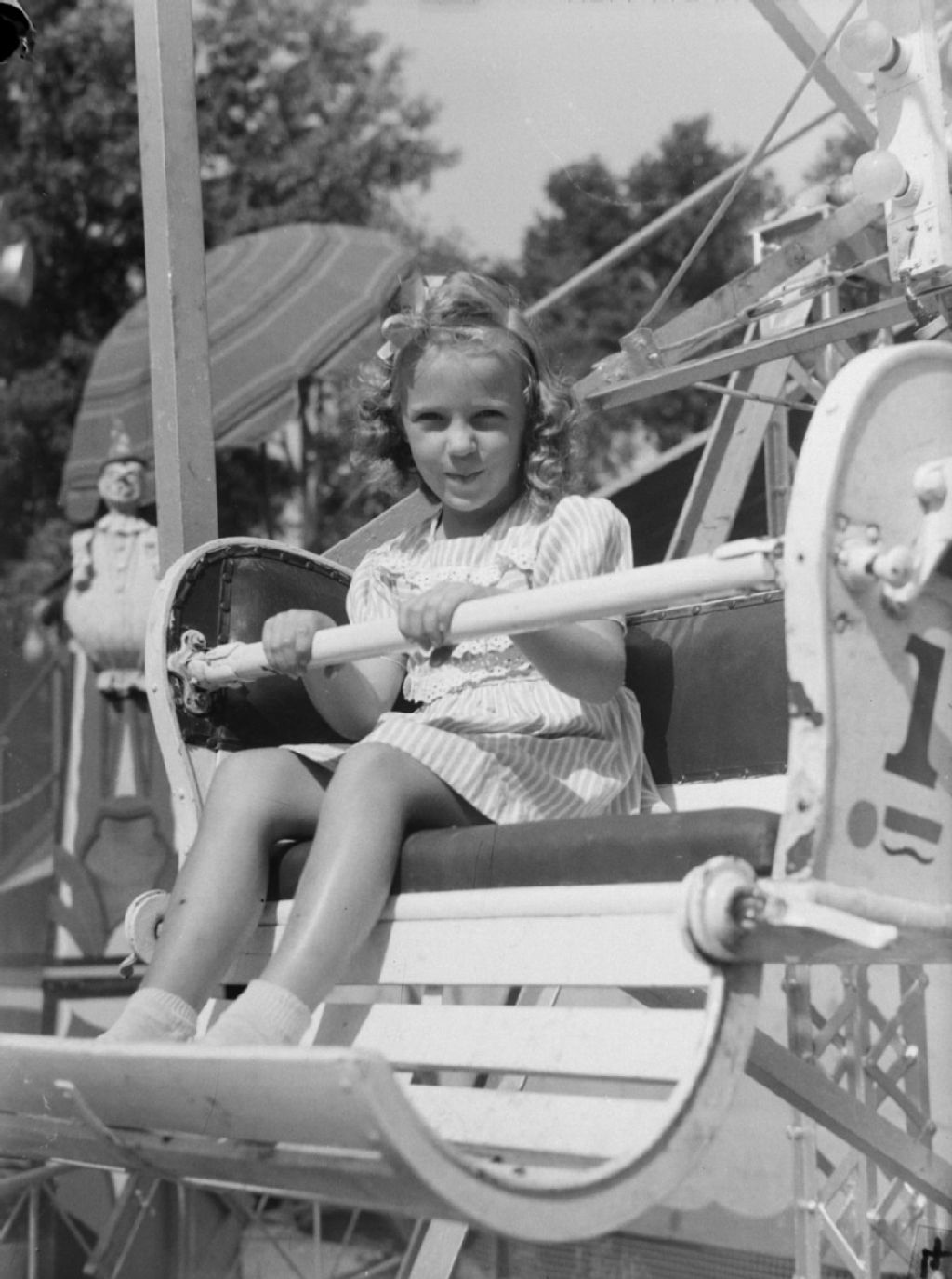 La petite Hélène Drouin est assise dans un banc de la grande roue du parc Belmont de Cartierville