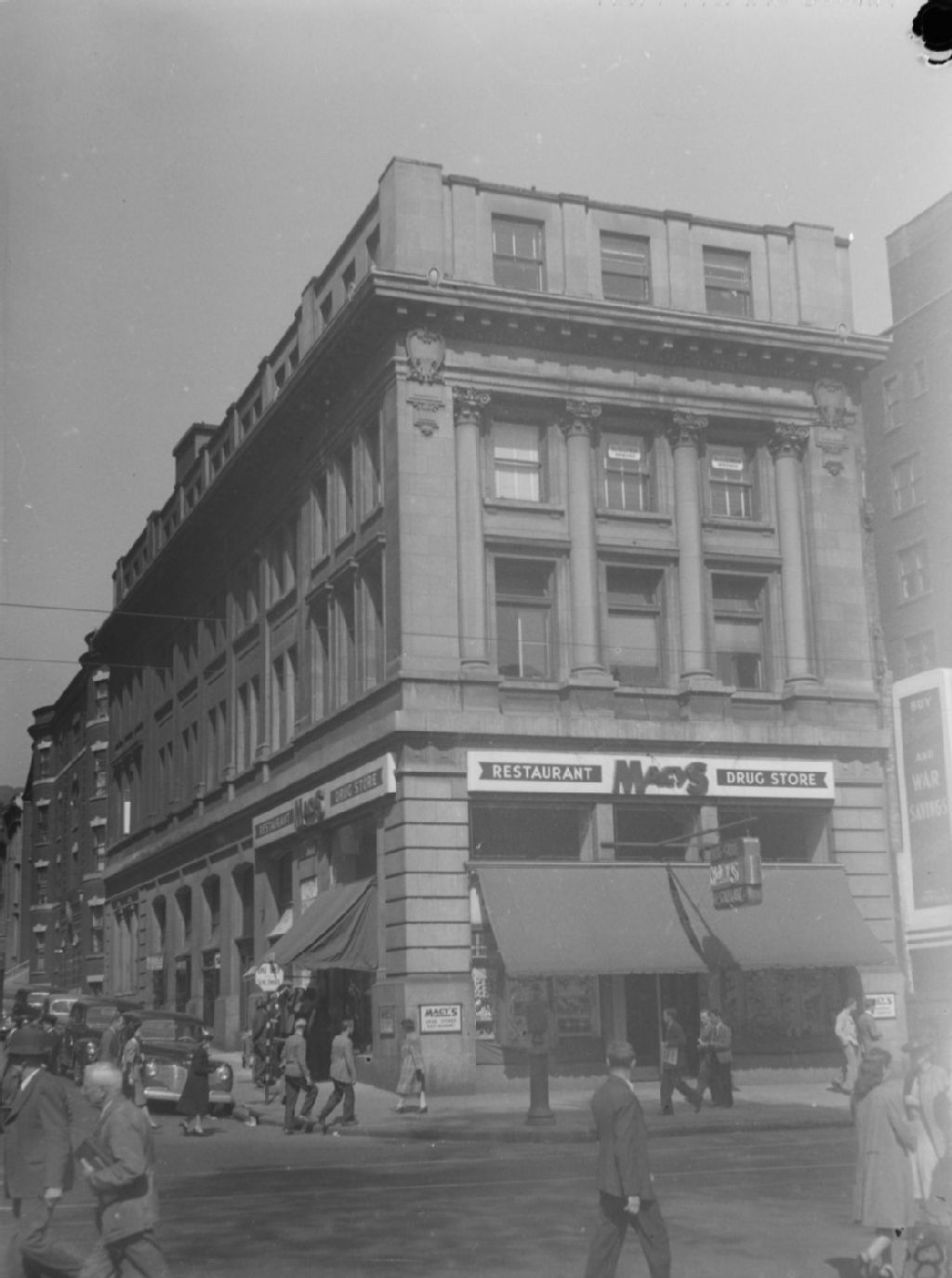 Nous voyons la pharmacie et le restaurant Macy's situé à l'intersection des rues Sainte-Catherine Ouest et Peel à Montréal