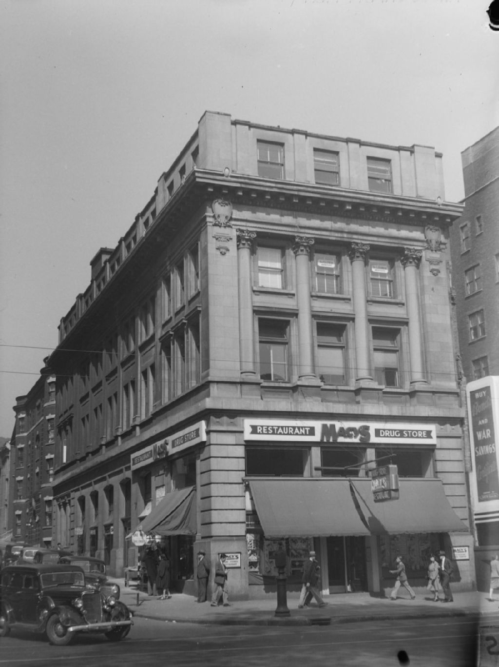 Nous voyons la pharmacie et le restaurant Macy's situé à l'intersection des rues Sainte-Catherine Ouest et Peel à Montréal
