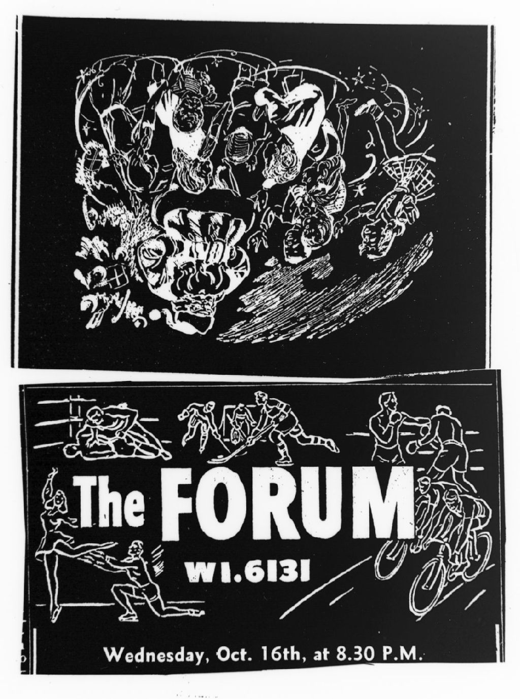 Nous voyons un dessin représentant le Père Noël entouré d'enfants et de la publicité pour le Forum de Montréal illustré de différentes activités sportives