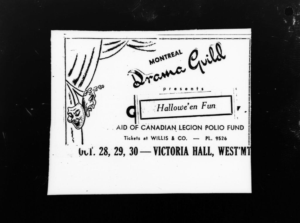 Nous voyons un arrière-plan de rideau de théâtre avec deux masques pour une publicité du spectacle «Hallowe'en Fun» de Montreal Drama Guild présenté au Victoria Hall de Montréal
