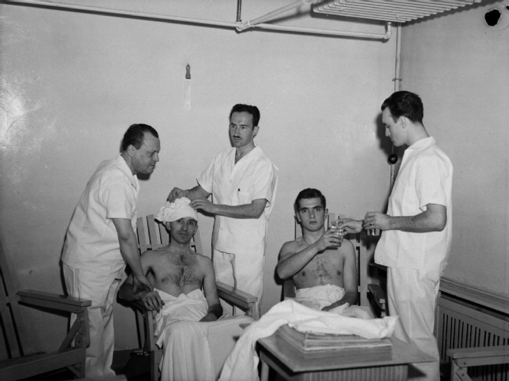 Deux jeunes hommes, entourés de trois soigneurs, passent un examen médical à la Palestre Nationale de la rue Cherrier à Montréal. Un soigneur prend le pouls d'un garçon