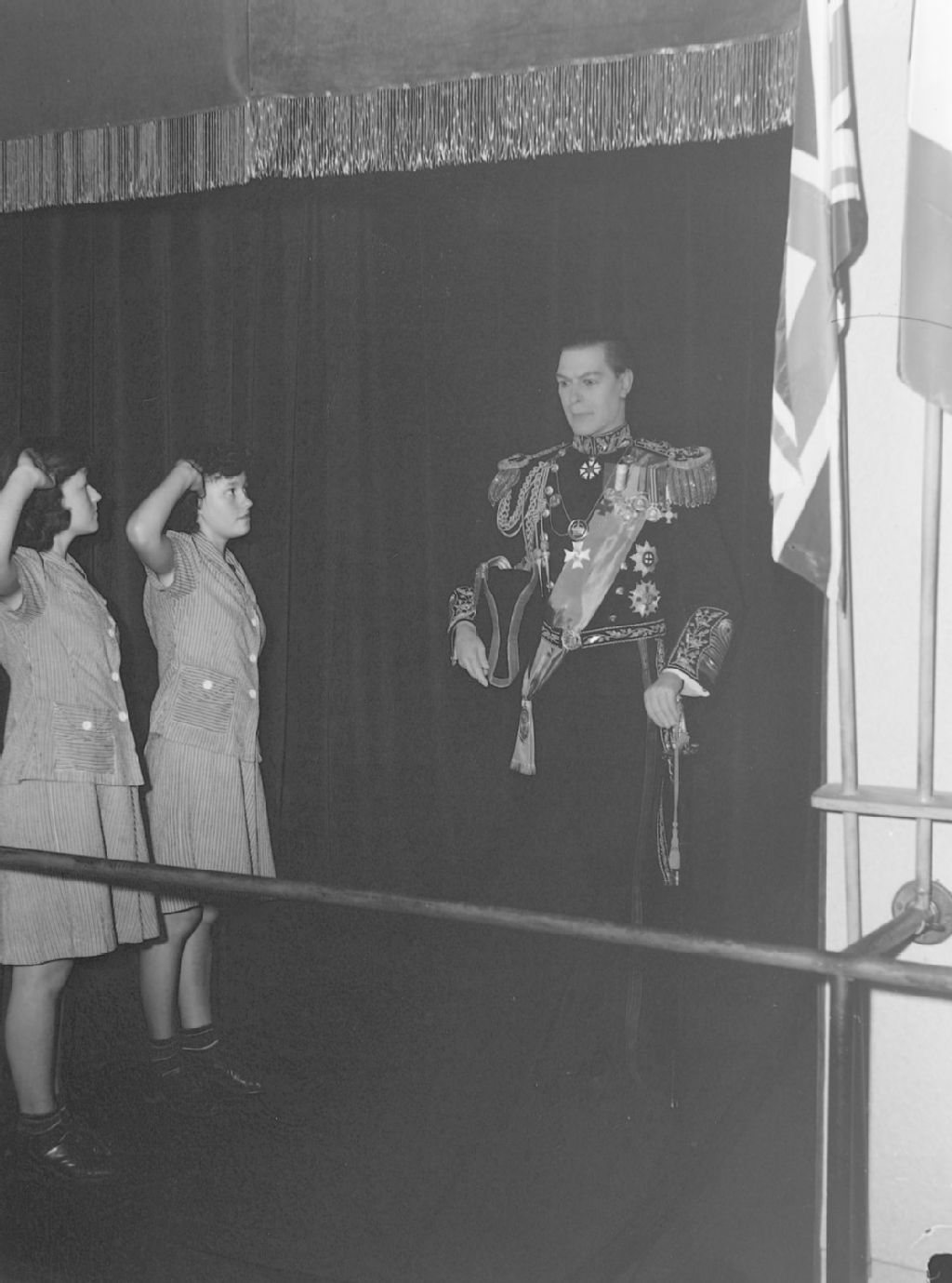 Les jumelles Hélène et Jacqueline Saint-Jean visitent le Musée historique canadien, musée de statues de cire situé sur le chemin Queen-Mary à Montréal. Elles font le salut militaire devant la statue du roi George VI