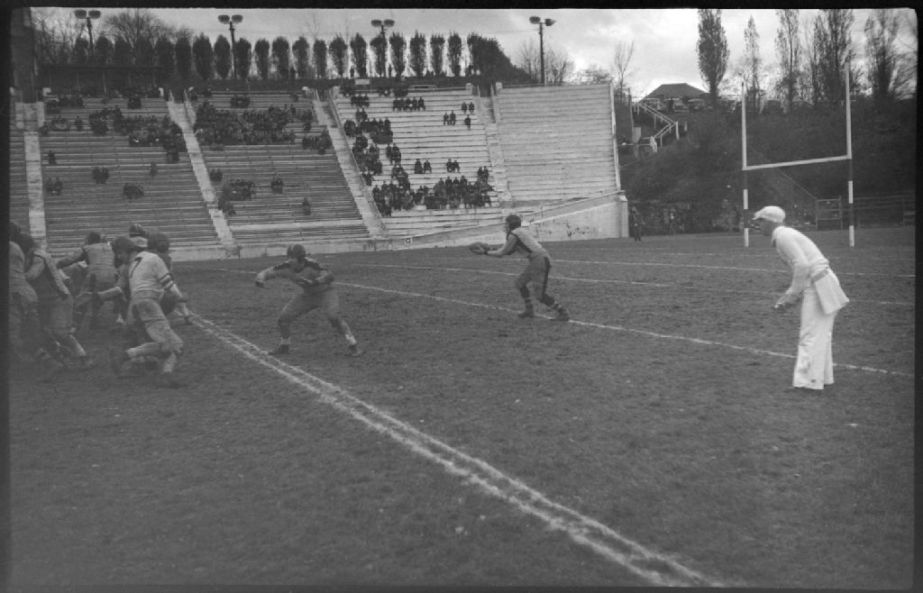 Au stade Percival Molson de l'Université de McGill à Montréal, lors d'un match de football opposant les équipes «Montreal Indians» et «Hamilton», nous voyons des joueurs sur le terrain et des spectateurs dans les gradins