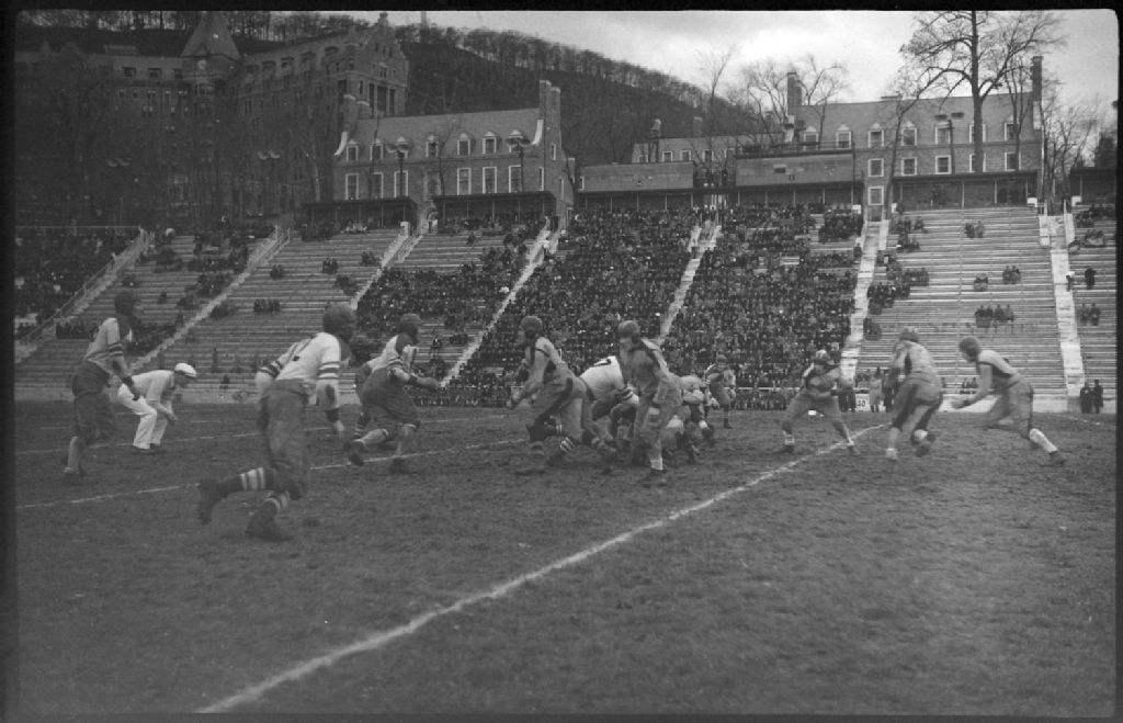 Au stade Percival Molson de l'Université McGill à Montréal, lors d'un match de football opposant les équipes «Montreal Indians» et «Hamilton», nous voyons de joueurs sur le terrain et des spectateurs dans les gradins. Nous remarquons, en arrière-plan, des pavillons de l'université