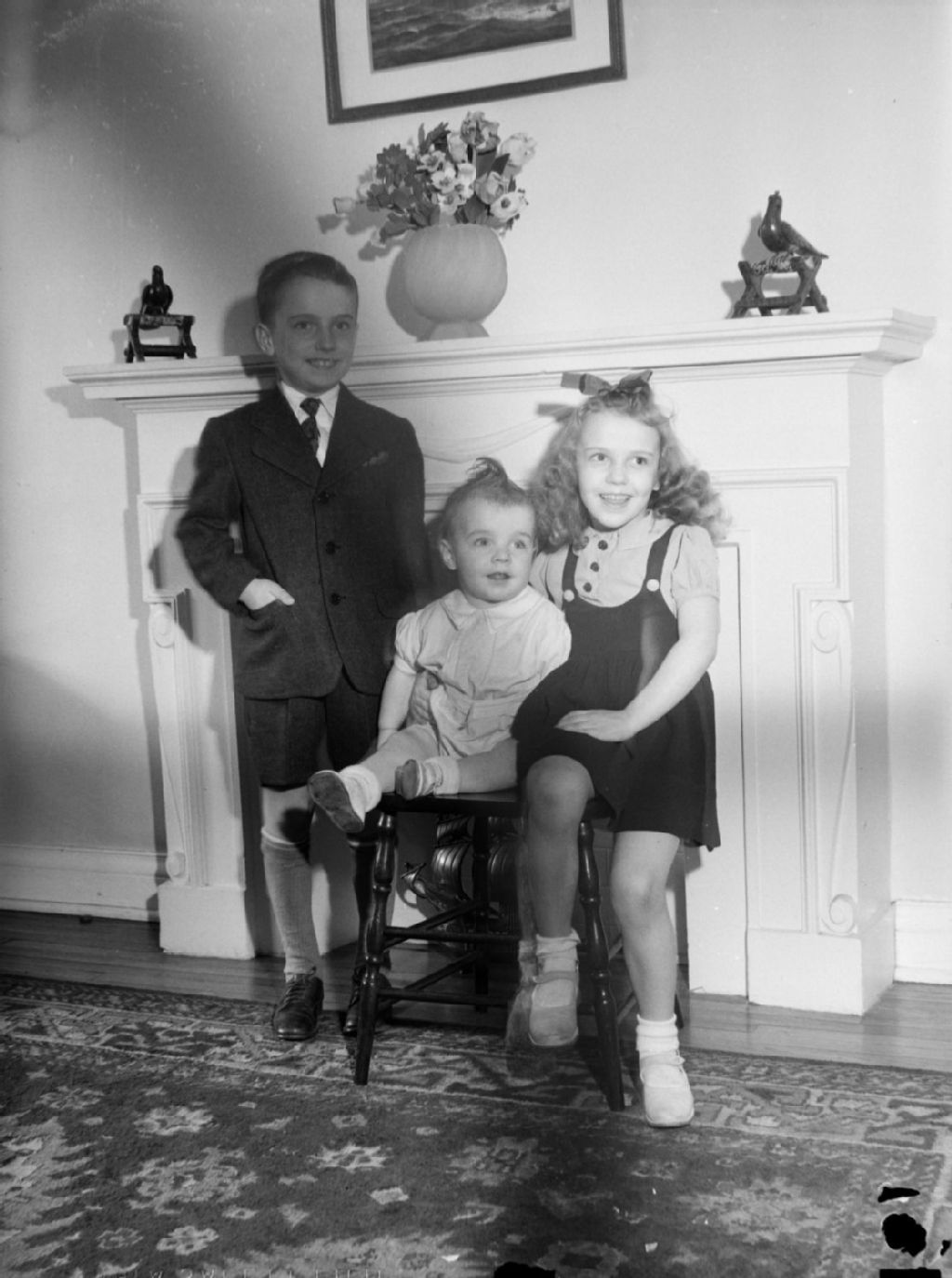 Nous voyons les trois enfants de monsieur Lucien Drouin devant un foyer