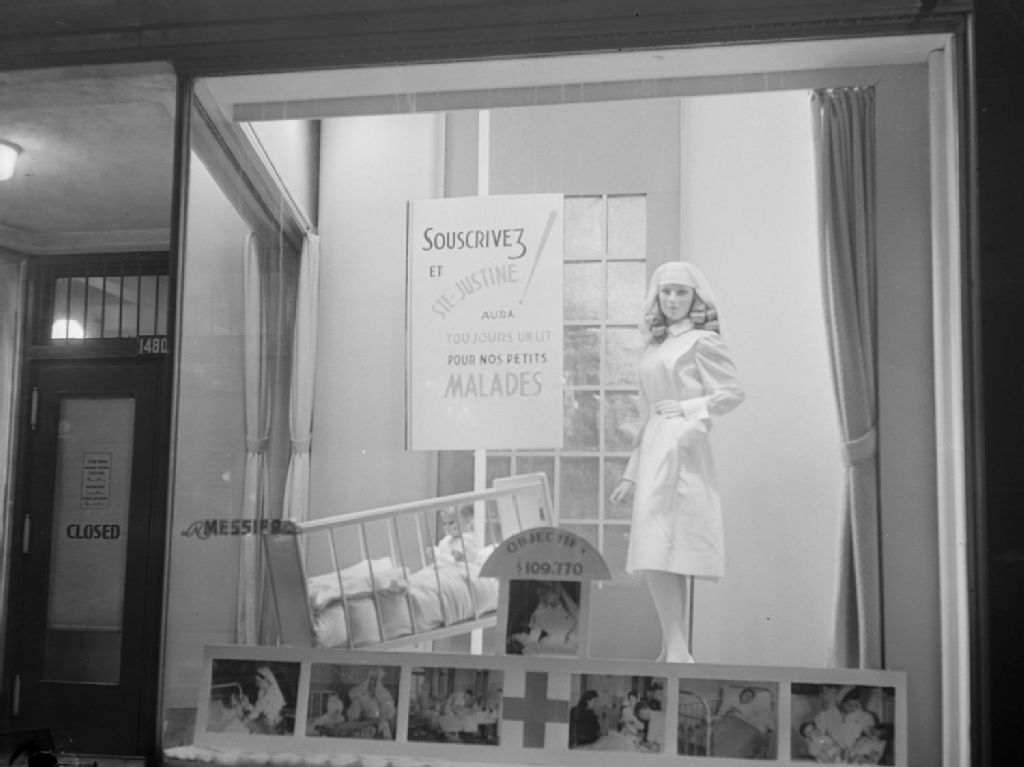Les photographies de Conrad Poirier illustrent l'affiche de la campagne de souscription de l'hôpital Sainte-Justine à Montréal présentée dans la vitrine du magasin LN Messier Ltée situé avenue du Mont-Royal Est à Montréal