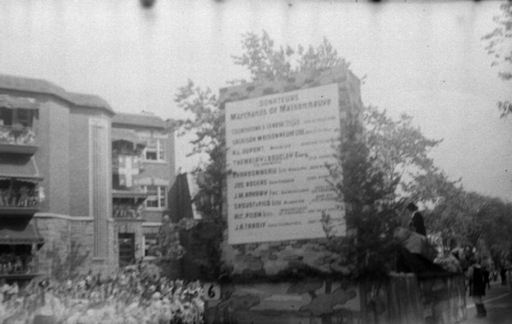 Nous voyons la liste des donateurs marchands de Maisonneuve à l'arrière d'un char allégorique du défilé de la Saint-Jean-Baptiste à Montréal