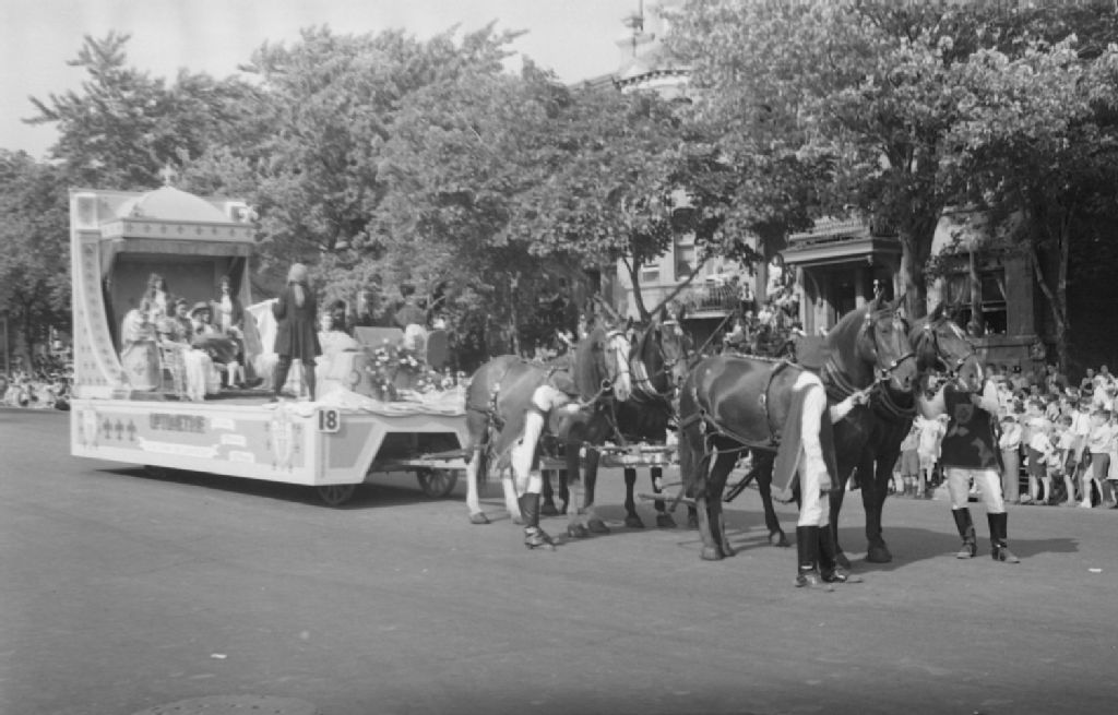 Un char allégorique tiré par quatre chevaux, dont le thème est l'«Optométrie à la cour de Louis XIV», fait partie du défilé de la Saint-Jean-Baptiste à Montréal