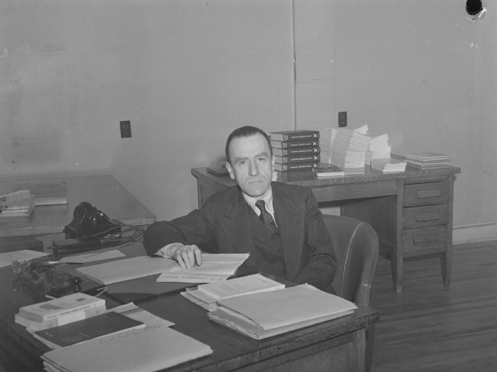 Monsieur Pierre Négrier, consul général de France, est assis à son bureau de la rue Stanley à Montréal