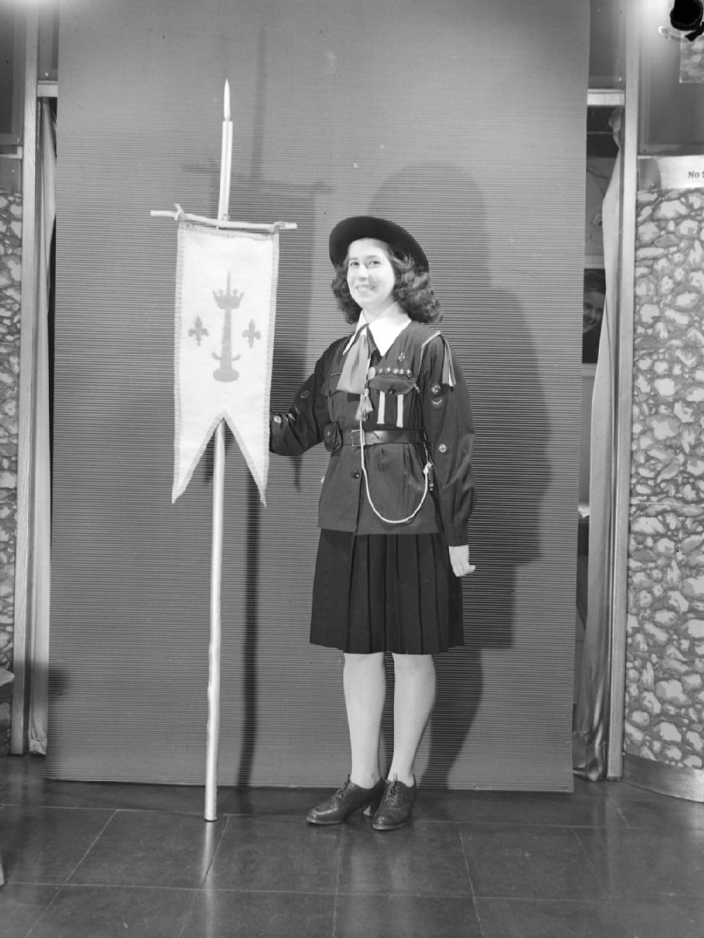 Lorraine Gingras, vêtue du costume de guide du mouvement scout, porte un étendard suspendu à une lance
