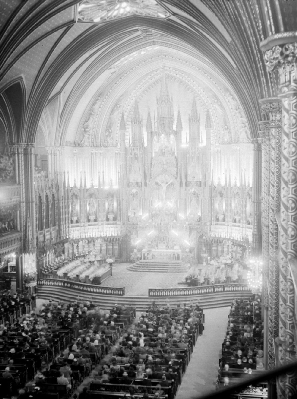 Nous voyons le choeur et l'assemblée de fidèles dans les bancs de la nef de la basilique Notre-Dame de Montréal