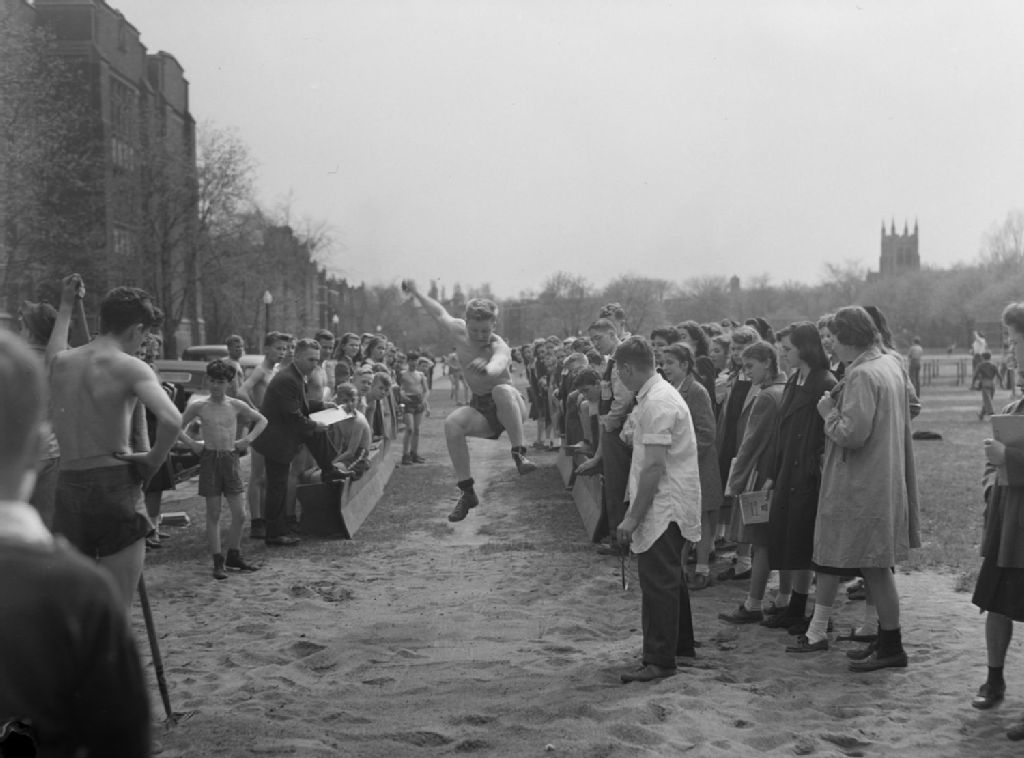 Un adolescent fait un saut en longueur lors de compétitions d'athlétisme disputées dans la cour de la «Westmount Junior High School»