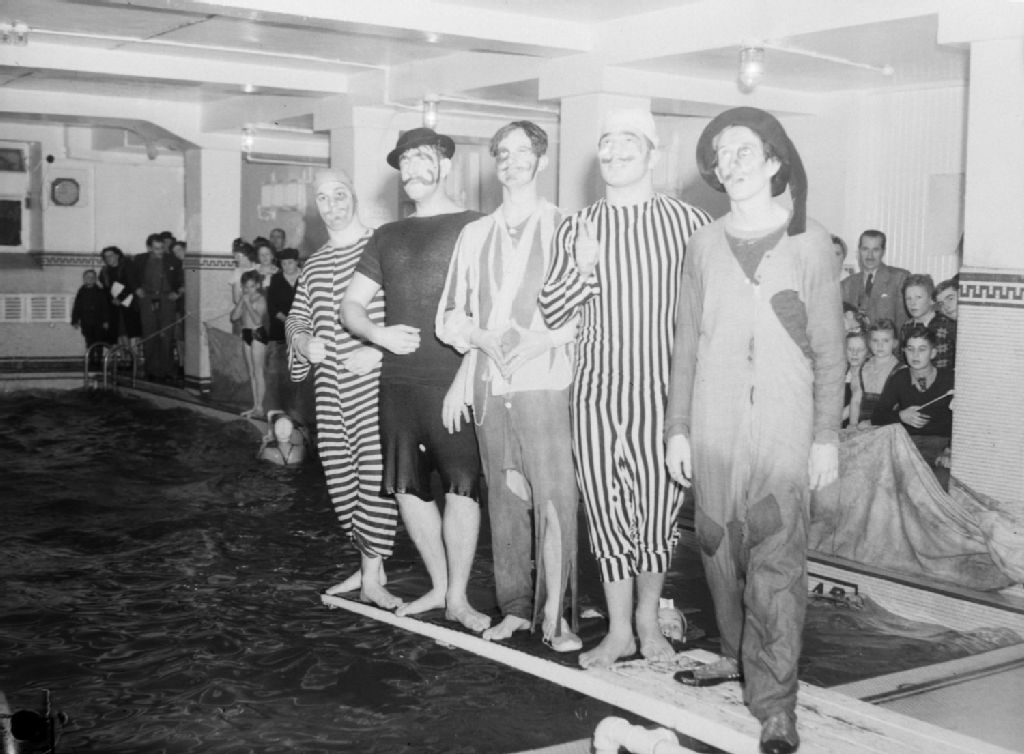 Cinq hommes costumés se tiennent sur le tremplin de la piscine de la North Branch Young Men's Christian Association du plateau Mont-Royal