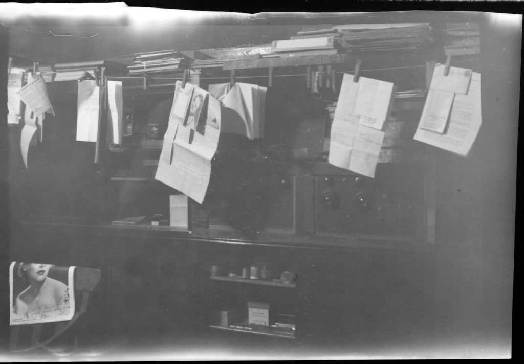 Documents et des photos suspendus par des épingles à linge à une corde avec, en arrière-plan, des étagères