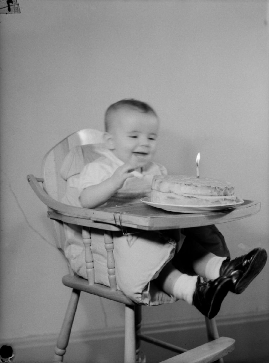 Le bébé Shirley Chrenicle, assise dans sa chaise haute, rit. Son gâteau d'anniversaire, sur lequel une chandelle est allumée, est posé sur la tablette de sa chaise haute