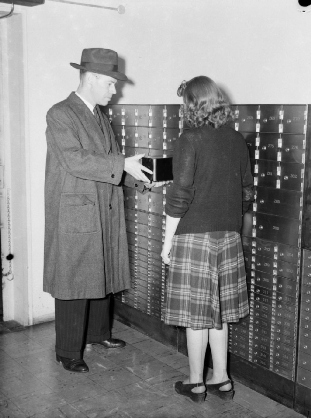 Un client et une caissière se trouvent dans la pièce des coffrets de sûreté de la Banque impériale du Canada située sur la rue Saint-Jacques Ouest à Montréal