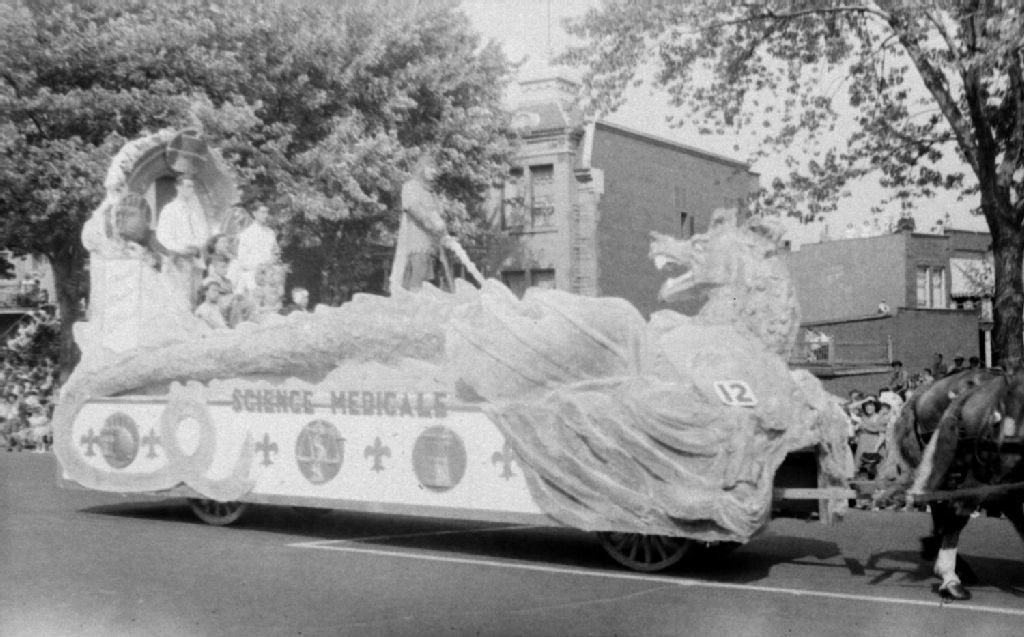 Parade de la Saint-Jean-Baptiste tenue à Montréal dans laquelle se retrouve le char allégorique intitulé «Science médicale». Le char est tiré par des chevaux
