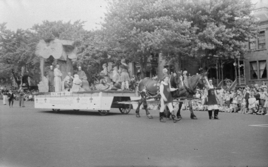 Char allégorique tiré par un attelage de chevaux sur lequel se trouve l'inscription «Science du droit». L'événement a lieu à l'occasion de la parade de la Saint-Jean-Baptiste dans les rues de Montréal