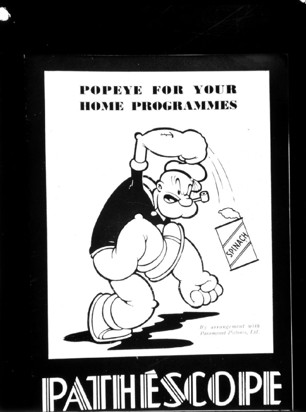 Nous voyons une photographie d'un dessin du personnage d'animation Popeye le marin. Ce dessin accompagne un texte publié dans le mensuel Pathéscope lors de la sortie du film «Blow me Down»