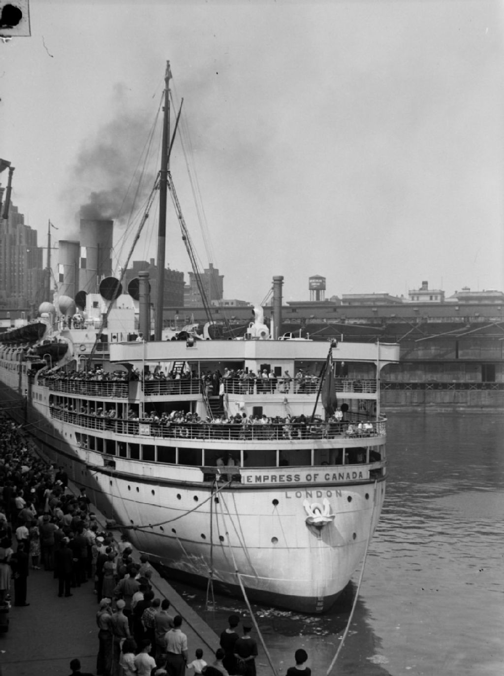 Le paquebot Empress of Canada accoste au port de Montréal. La foule rassemblée sur le pont salue les visiteurs réunis sur le quai
