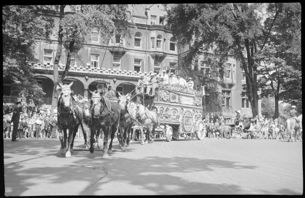 Nous voyons déambulant dans une rue de Montréal un véhicule de foire très ornementé, portant les inscriptions «Cole Bros» et «Asia», tiré par un équipage de chevaux et surmonté par des artistes de cirque costumés. Derrière suit une calèche tirée par des poneys. Une foule de spectateurs assiste à cette parade