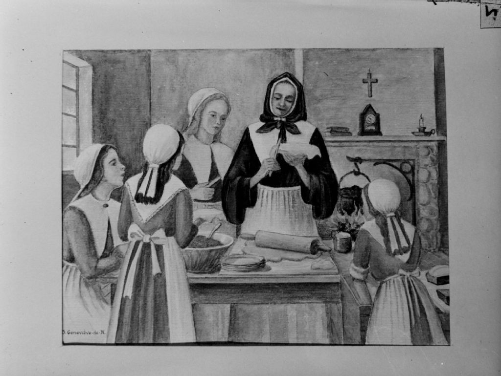 Nous voyons une toile de S. S. Geneviève-de-N. représentant Marguerite Bourgeoys enseignant la cuisine à des filles en Nouvelle-France. Cette toile est exposée sur un mur de la maison-mère de la Congrégation de Notre-Dame située sur la rue Sherbrooke Ouest à Montréal (devenue le Collège Dawson)