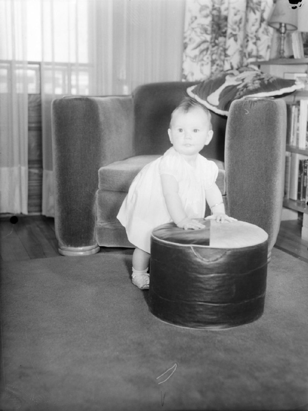 Le bébé Perron se tient à un pouf devant un fauteuil