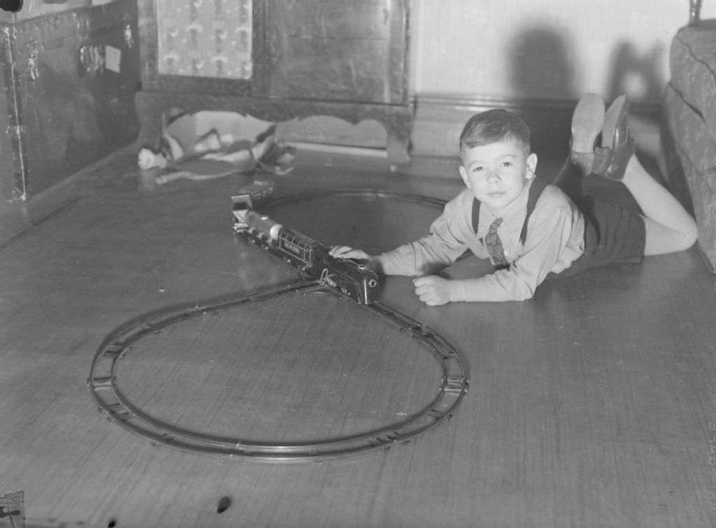 Le petit garçon de madame Annette Beaudoin fait rouler son train en miniature sur une voie ferrée en forme de huit