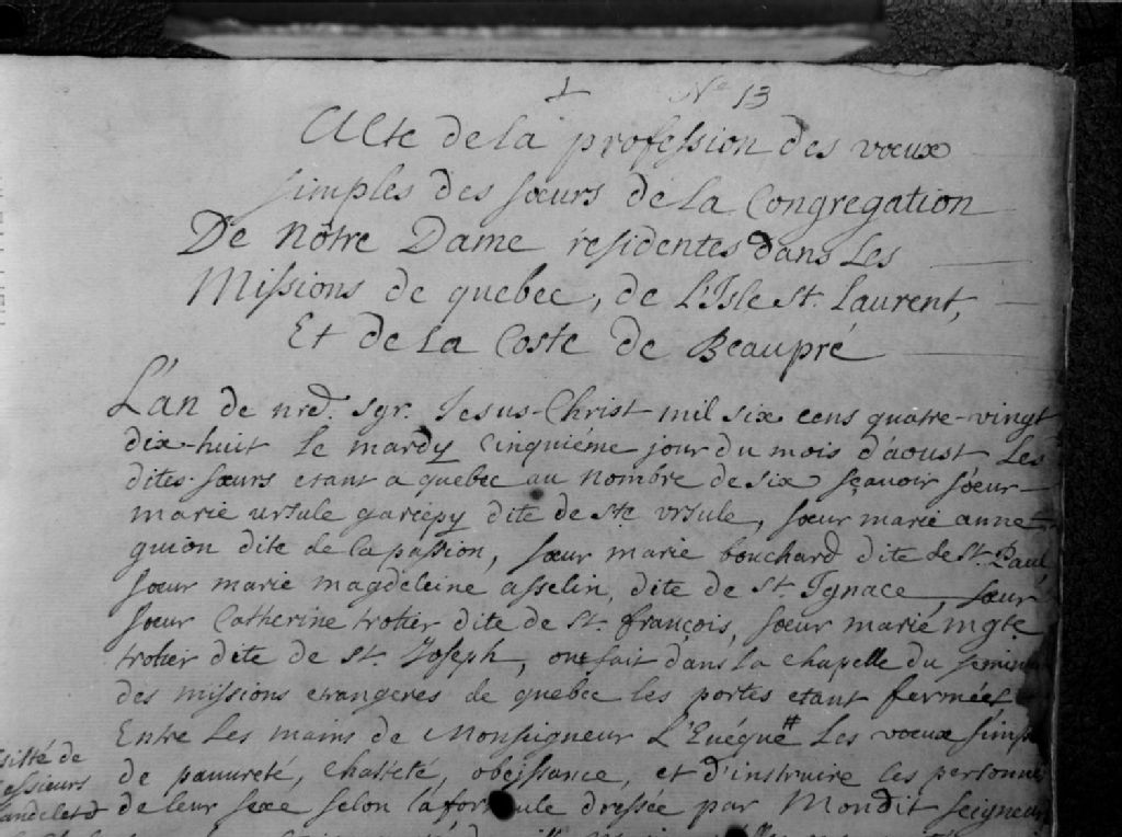 Nous voyons un extrait du manuscrit de l'«Acte de la proffession des voeux de simples des soeurs de la Congrégation de Nôtre Dame résidentes dans les missions de Quebec, de l'Isle St. Laurent, et de la Coste de Beaupré»