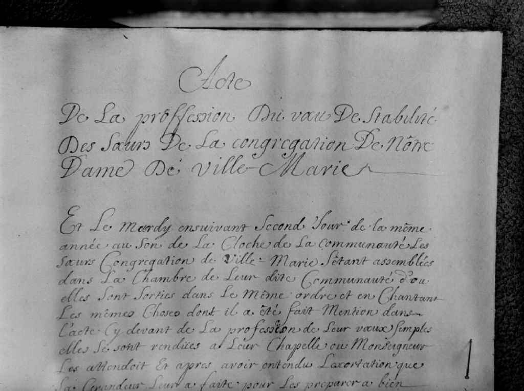 Nous voyons un extrait du manuscrit de l'«Acte de la proffession du voeu de stabilité des soeurs de la Congrégation de Nôtre Dame de Ville-Marie»