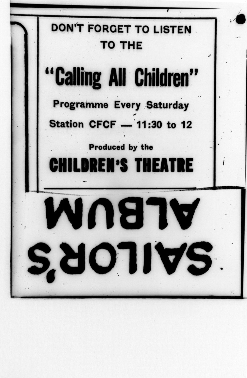 Nous voyons l'annonce publicitaire de l'émission «Calling All Children» présentée par le Children's Theatre à CFCF, station de radio de Montréal
