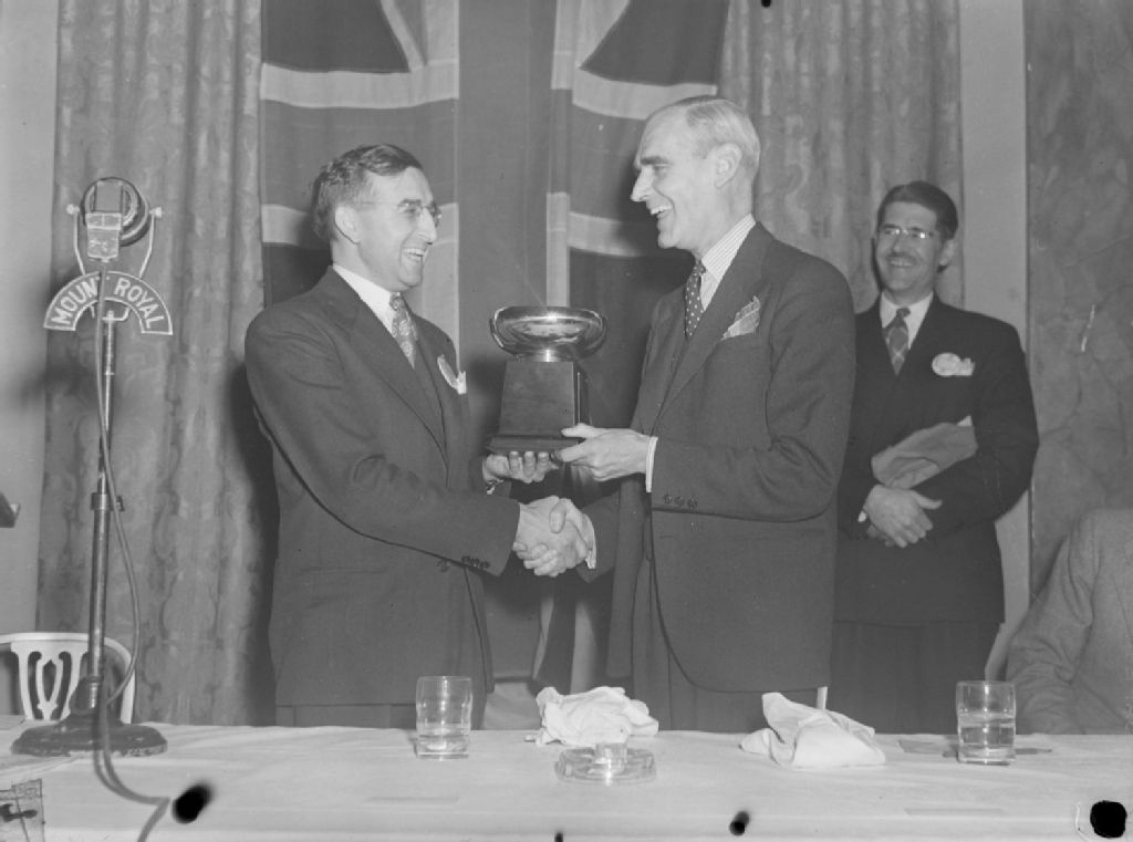 Il y a remise de trophée lors d'une réunion d'une chambre de commerce à l'hôtel Mount Royal situé à l'angle des rues Peel et Sainte-Catherine Ouest à Montréal