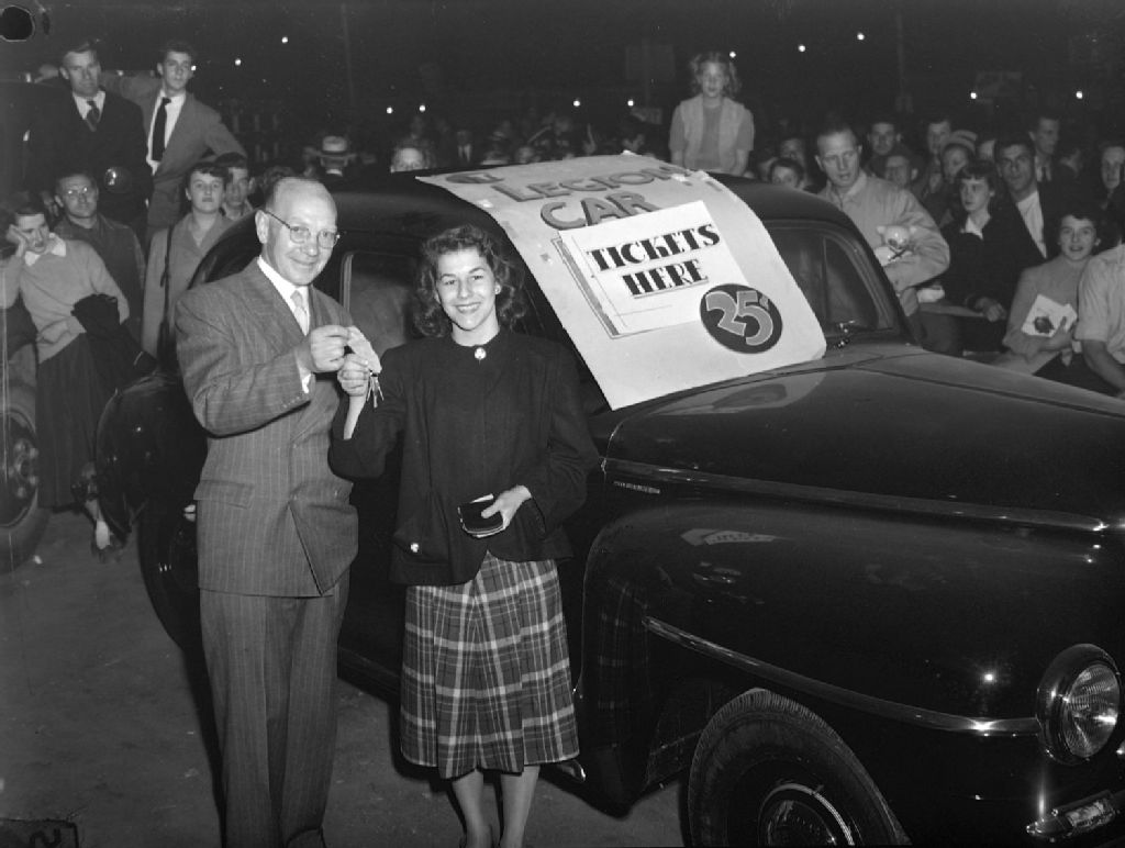 Une jeune femme reçoit, des mains d'un organisateur de la foire de Notre-Dame-de-Grâce, les clés de la voiture de la Légion canadienne qu'elle a gagnée à la loterie foraine