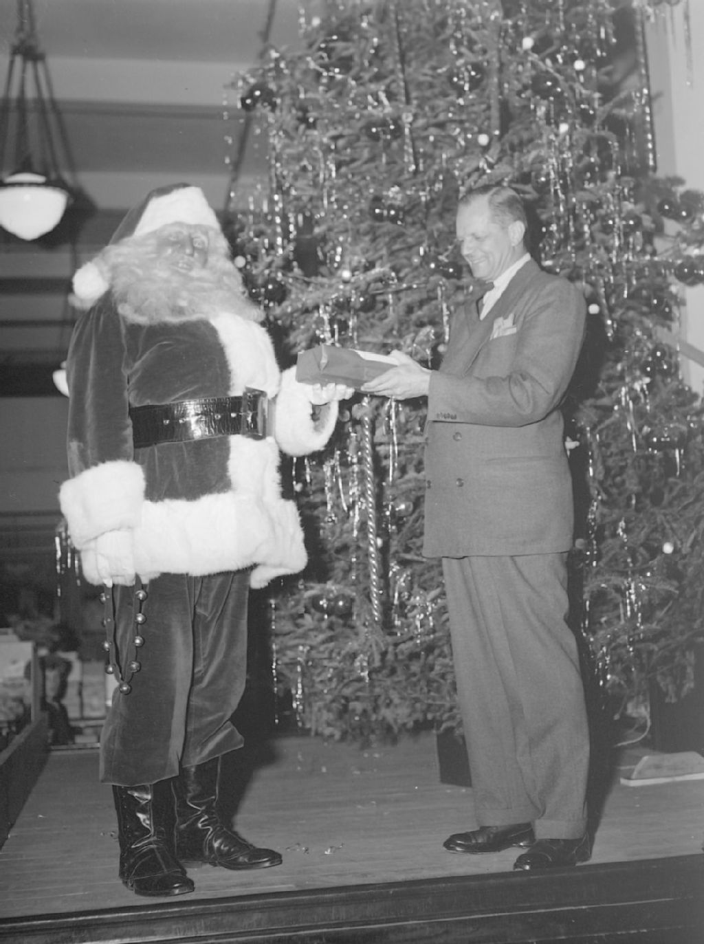 La Légion canadienne organise une collecte de Noël pour les hommes démunis. Un dignitaire offre un cadeau au père Noël lors du lancement officiel