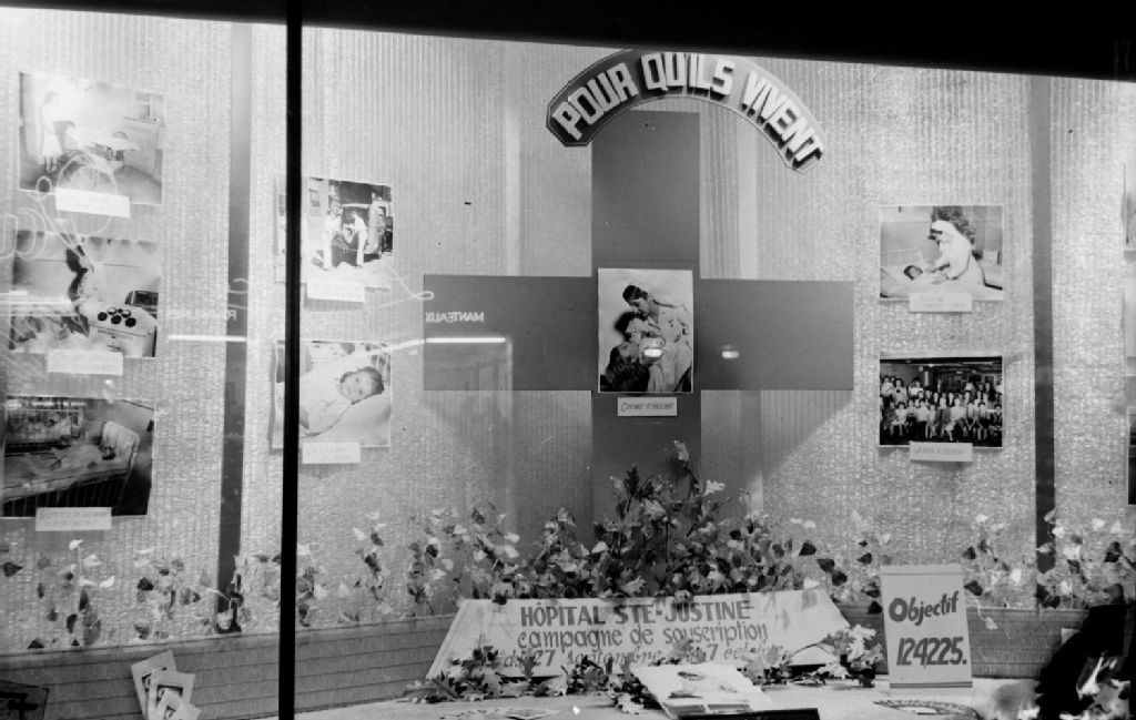 Nous voyons des affiches de la campagne de souscription de l'hôpital Sainte-Justine. Illustrées de photos de Conrad Poirier, ces affiches sont dans la vitrine du magasin Dupuis Frères Ltée de la rue Sainte-Catherine Est à Montréal