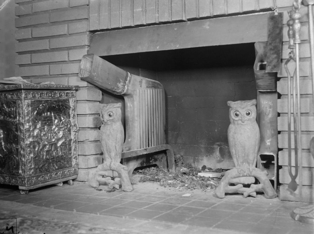 Nous voyons l'âtre de la cheminée à foyer ouvert des MacFarlane. Deux hiboux l'encadrent