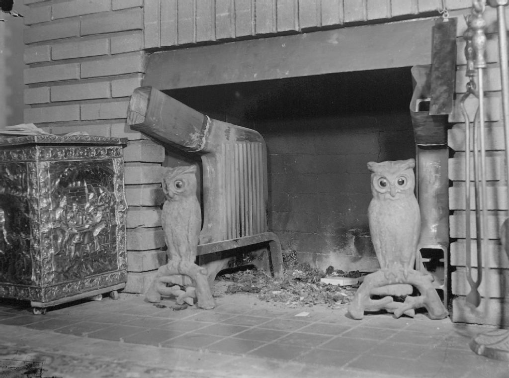Nous voyons l'âtre de la cheminée à foyer ouvert des MacFarlane. Deux hiboux l'encadrent