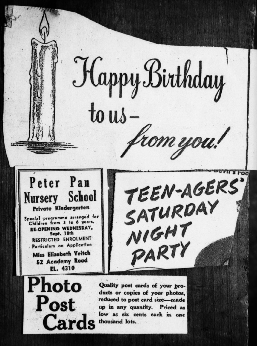 Nous voyons l'annonce publicitaire de la maternelle Peter Pan, située chemin Academy à Westmount, l'annonce publicitaire de cartes postales avec photographies et des titres