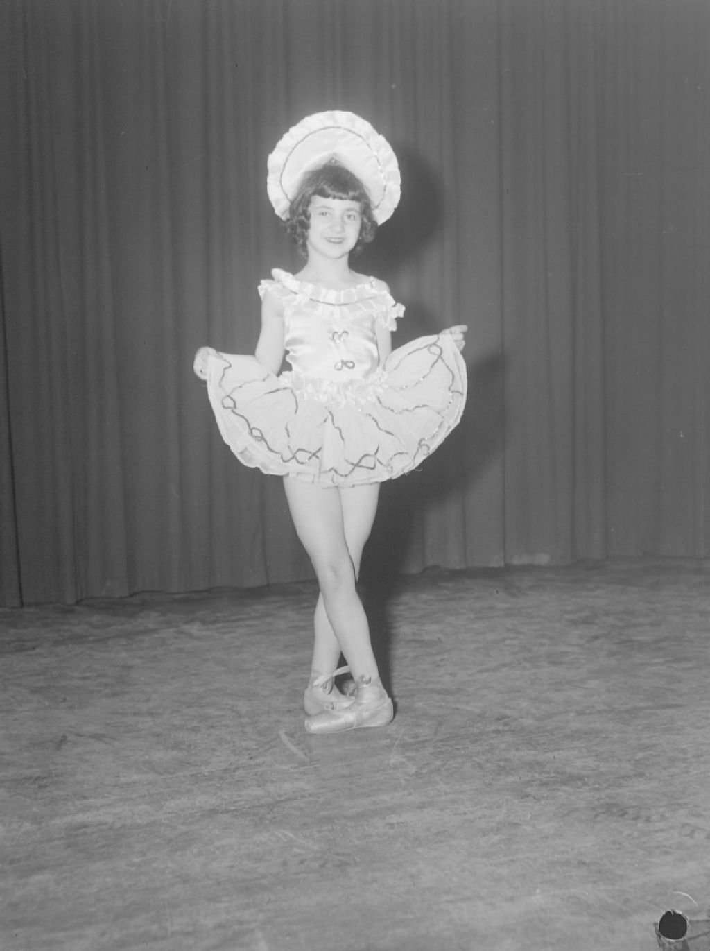 Une petite fille suit des cours de ballet à la Mount Royal School, située rue Saint-Urbain à Montréal. Elle salue en mettant sa jupe en éventail