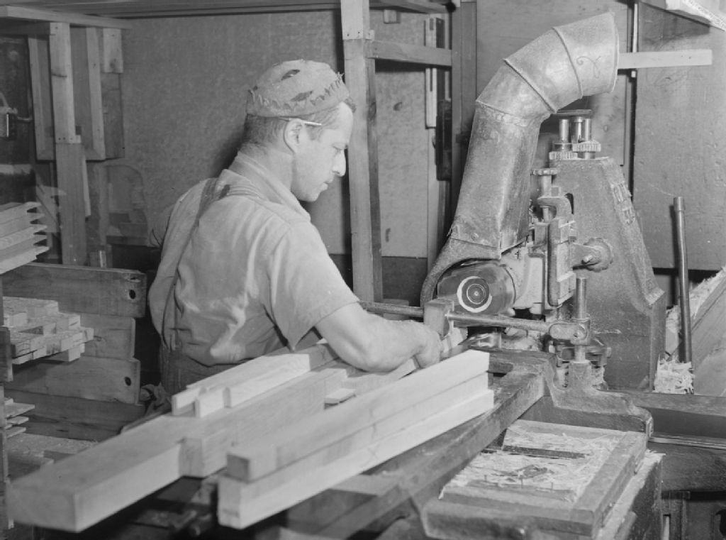 Un jeune homme coupe le bois sur un plateau de sciage à une institution des sourds-muets