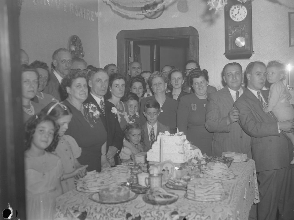 Madame et monsieur Lambert sont entourés de leurs enfants, petits-enfants, parents et amis. Ils sont près de la table du buffet de leur anniversaire de mariage