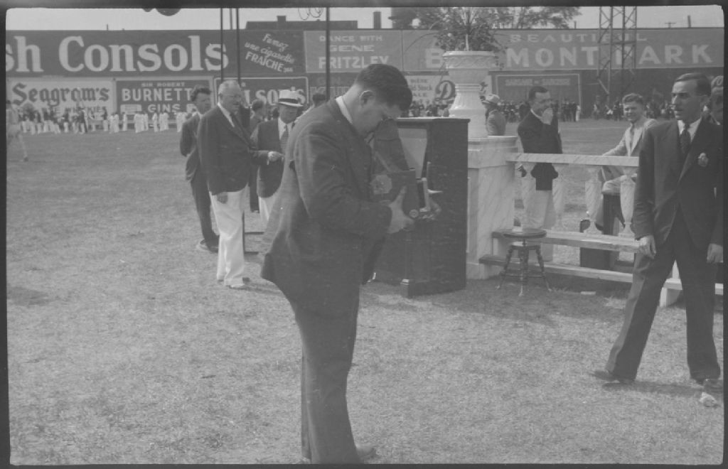 Lors de compétitions sportives organisées dans le cadre du festival des Écoles catholiques au Stade Delorimier à Montréal, nous voyons un photographe faisant une prise de vue à l'aide d'un appareil professionnel. En arrière-plan, nous apercevons des affiches publicitaires