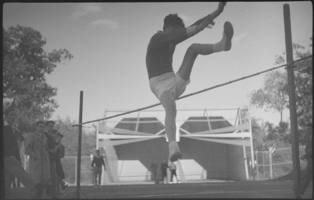 Nous voyons un jeune homme répondant au nom de Paul Charpentier exécutant un saut en hauteur derrière le collège Jean-de-Brébeuf, situé au 3200 chemin Côte-Sainte-Catherine