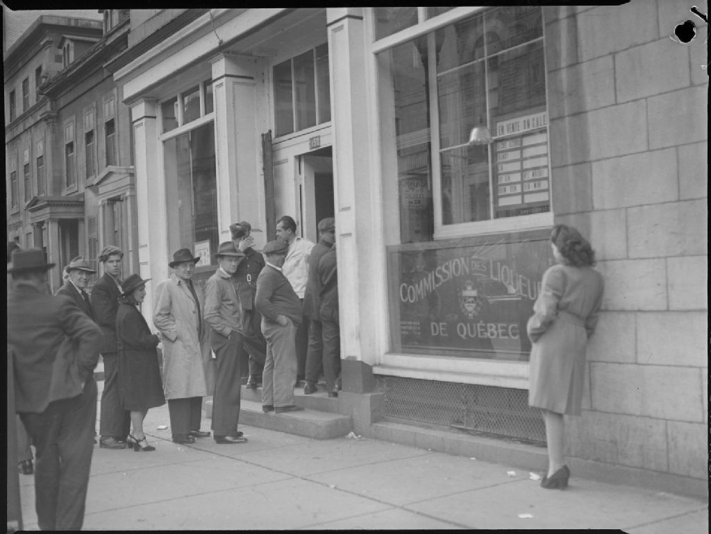 Des hommes qui font la file pour pénétrer dans le magasin de la Commission des liqueurs au 1150 rue Saint-Denis à Montréal. Nous remarquons un homme en costume de militaire et une femme appuyée sur la façade de l'immeuble. À travers la fenêtre, nous pouvons voir l'intérieur du magasin. Le quartier où est situé ce magasin est qualifié de «pauvre» par le photographe