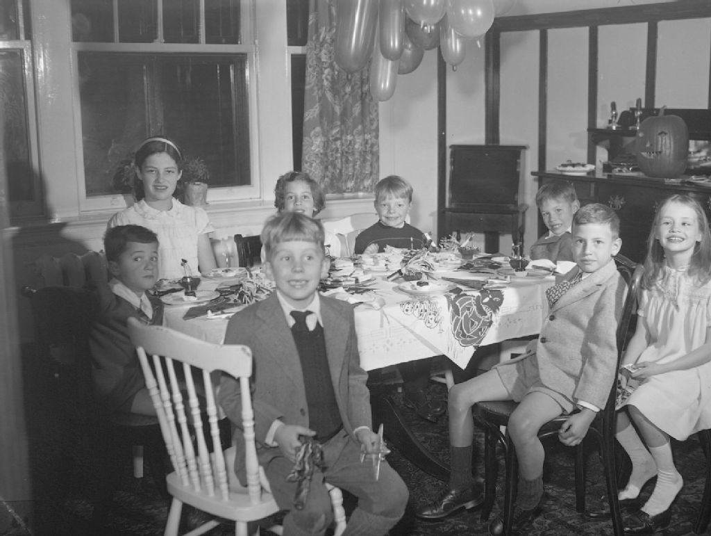 Des enfants sont réunis pour célébrer l'halloween dans la salle à manger de la famille Brown. Nous remarquons le buffet, les ballons et la citrouille